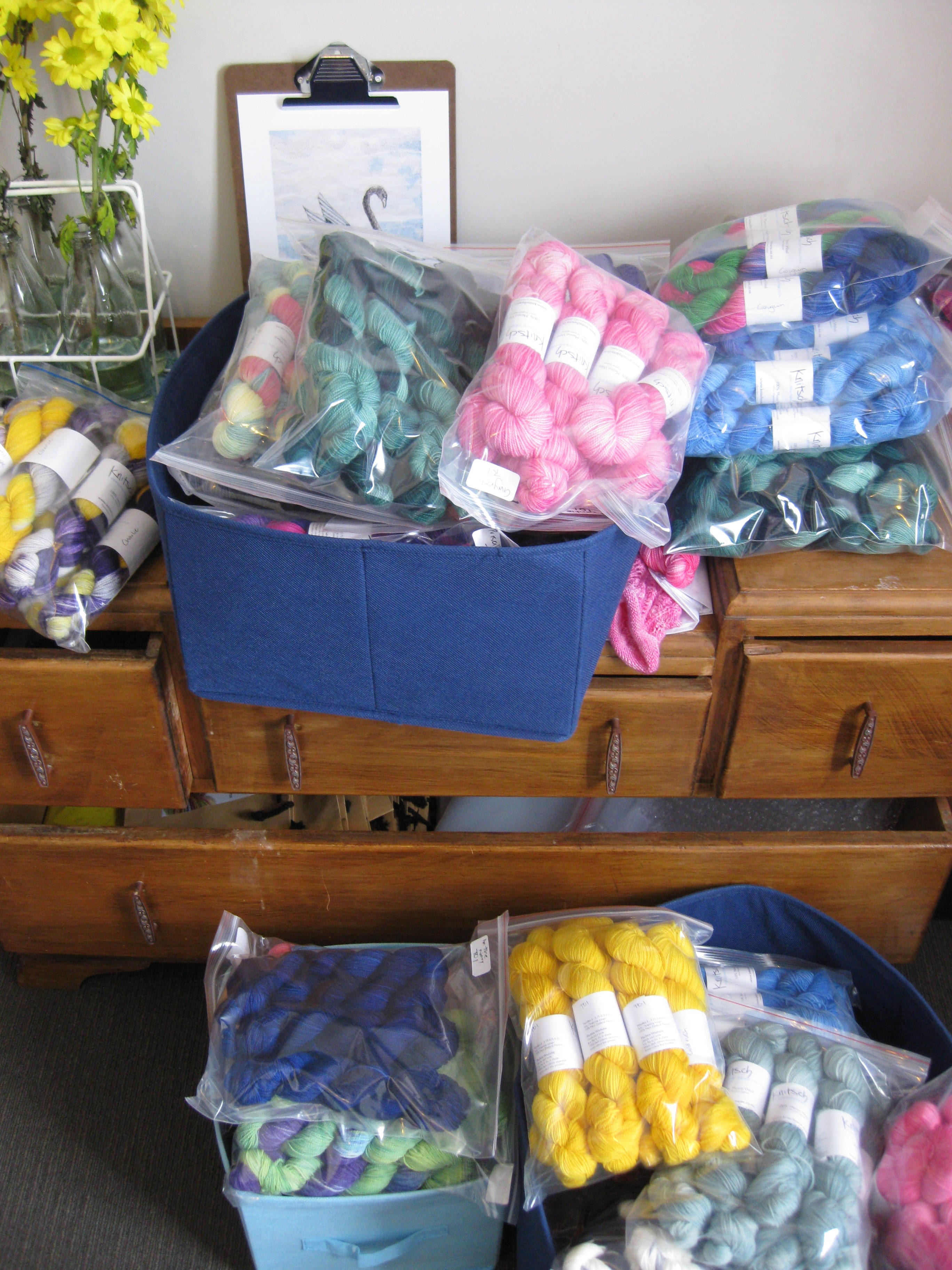 There is a whole laundry basket with Lea being labelled, plus skeins that I have to label – I better sell some of this as I need my office back!